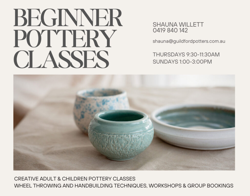 Janice Bradley – 0404 998 734 Saturday mornings for all levels of pottery.